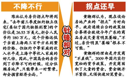 “房地产难以承担支柱产业的功能,房价的真正拐点已经到来!”座谈会一开场,省体改研究会副会长陈池就连续“炮轰”目前的房地产政策和房地产商;而随后发言的广东省地产商会副会长兼秘书长黄潮辉则完全持反对意见,对今年房地产市场仍审慎看好。